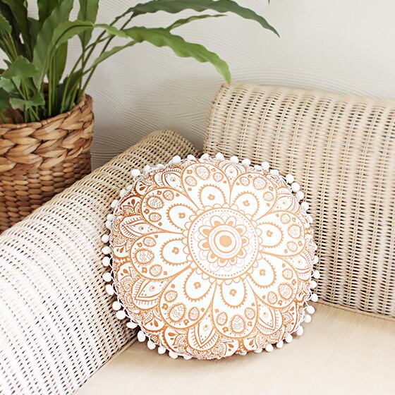 送料無料! ラウンドクッションカバー エスニック柄 丸型 円形 ブラウン ベージュ 茶