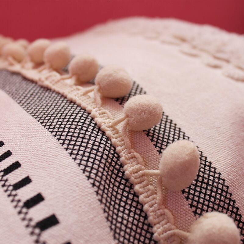 模様の間にフリンジとポンポンの組み合わせが最高にお洒落で他には無い個性を感じます。 北欧テイストから、白黒インテリアやナチュラルボヘミアンインテリアにピッタリ。
