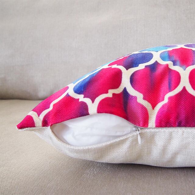 赤から水色に変わるグラデーションがきれいなクッションカバー。